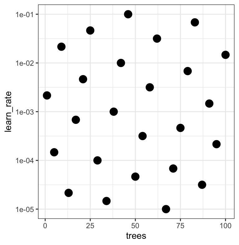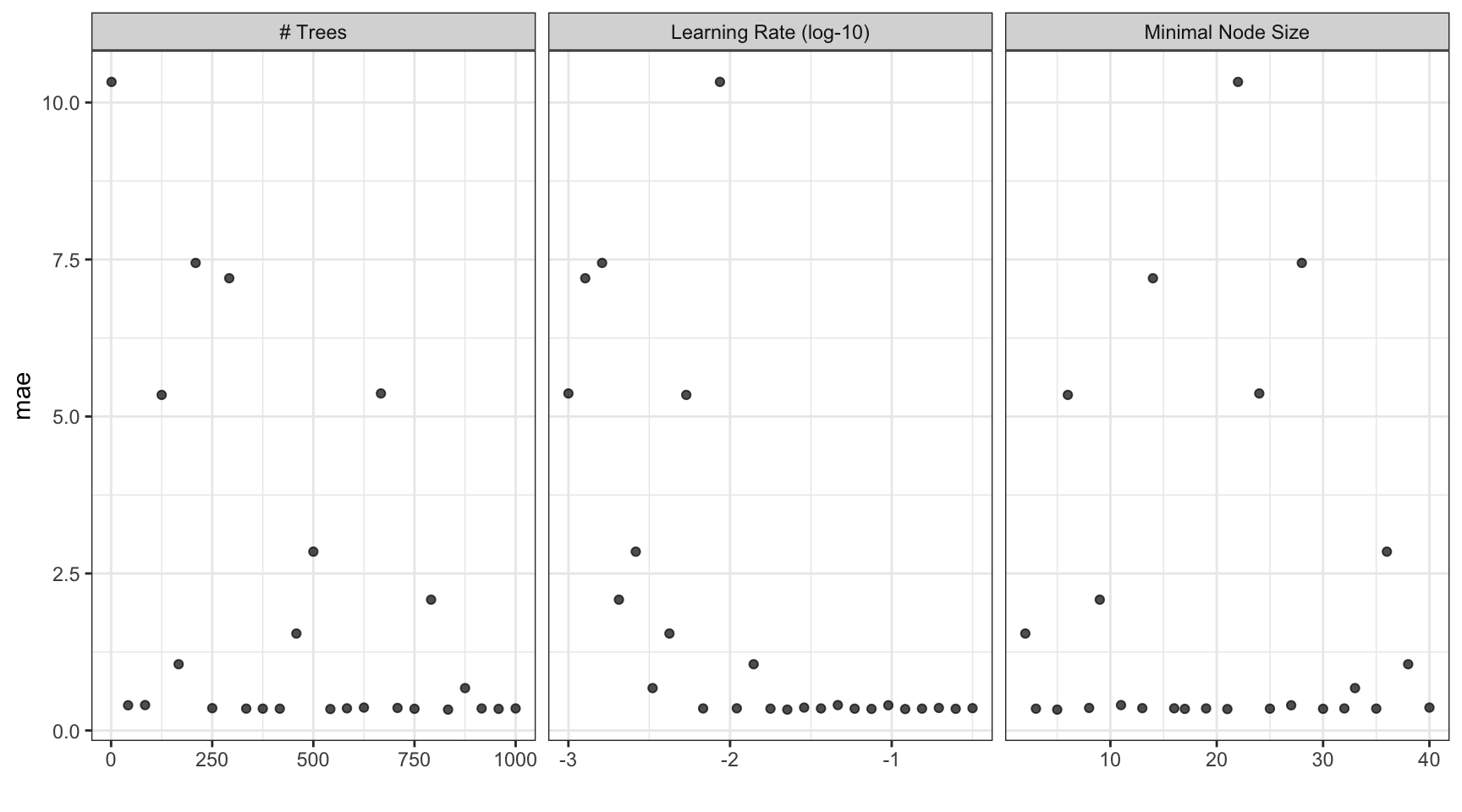 set.seed(9)ctrl <-control_grid(save_pred =TRUE)b_res <- b_wflow |>tune_grid(resamples = folds,grid =25,# The options below are not required by defaultparam_info = b_param, control = ctrl,metrics =metric_set(mae) )
