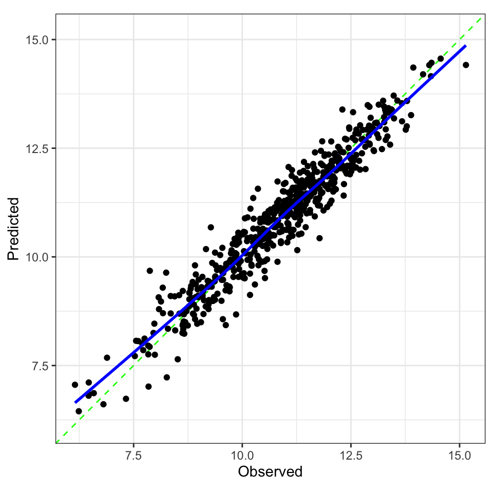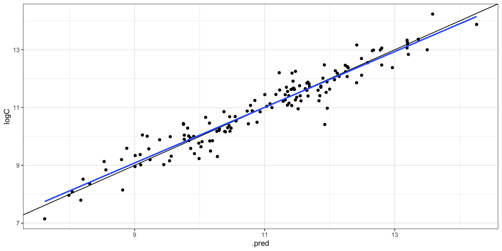 collect_metrics(final_fit)#> # A tibble: 2 × 4#> .metric .estimator .estimate .config #> <chr> <chr> <dbl> <chr> #> 1 rmse standard 0.391 Preprocessor1_Model1#> 2 rsq standard 0.918 Preprocessor1_Model1collect_predictions(final_fit) |>ggplot(aes(.pred, logC)) +geom_point() +geom_abline() +geom_smooth(method ="lm", se =FALSE)