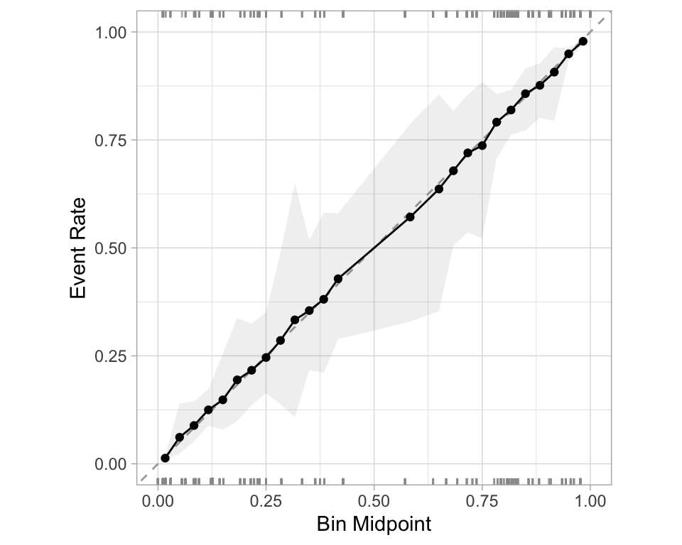 Calibration plot: We bin observations according to predicted probability. In the bin for 20%-30% predicted prob, we should see an event rate of ~25% if the model is well-calibrated.