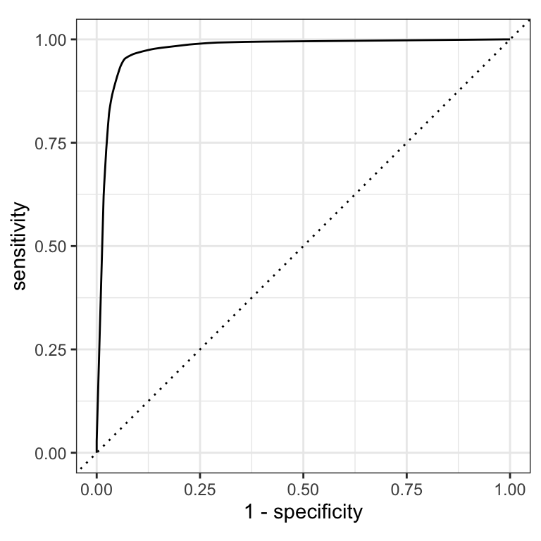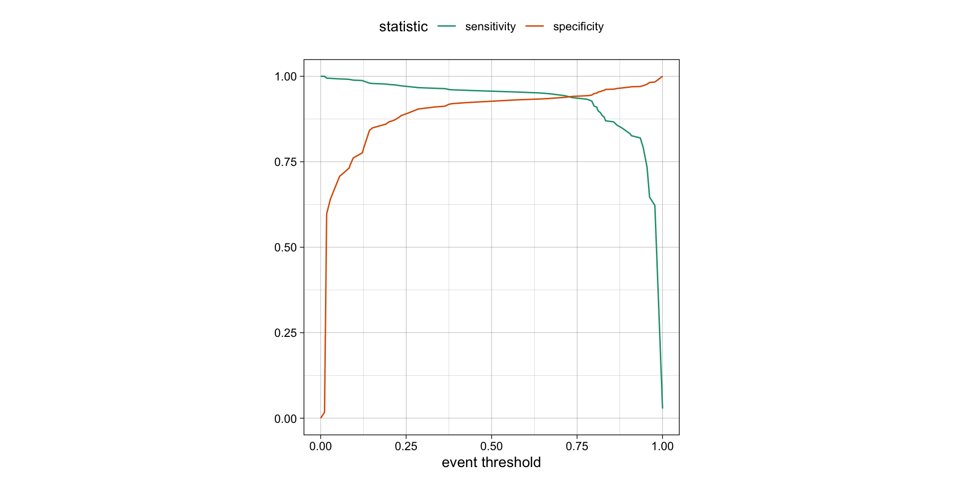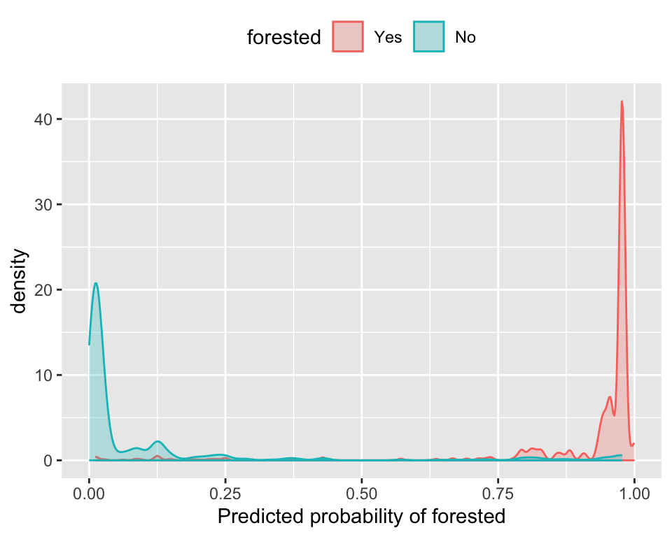 augment(forested_fit, new_data = forested_train) |>group_by(tree_no_tree) |>accuracy(truth = forested, estimate = .pred_class)#> # A tibble: 2 × 4#> tree_no_tree .metric .estimator .estimate#> <fct> <chr> <chr> <dbl>#> 1 Tree accuracy binary 0.946#> 2 No tree accuracy binary 0.941augment(forested_fit, new_data = forested_train) |>group_by(tree_no_tree) |>specificity(truth = forested, estimate = .pred_class)#> # A tibble: 2 × 4#> tree_no_tree .metric .estimator .estimate#> <fct> <chr> <chr> <dbl>#> 1 Tree specificity binary 0.582#> 2 No tree specificity binary 0.974