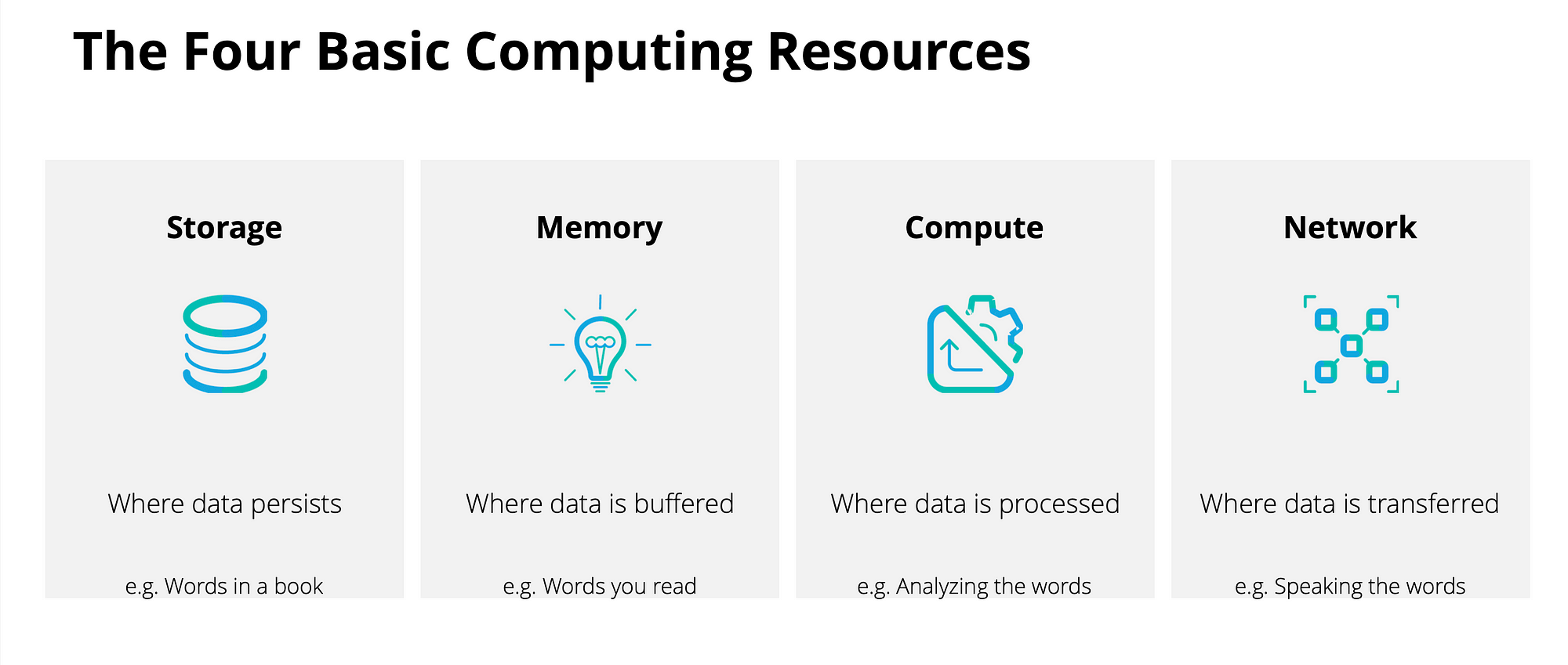 Computer: An electronic device for storing and processing data, typically in binary form, according to instruction. Computers store persistent data on disk, ephemeral data in memory, and executes processes with the CPU (Central Processing Unit).