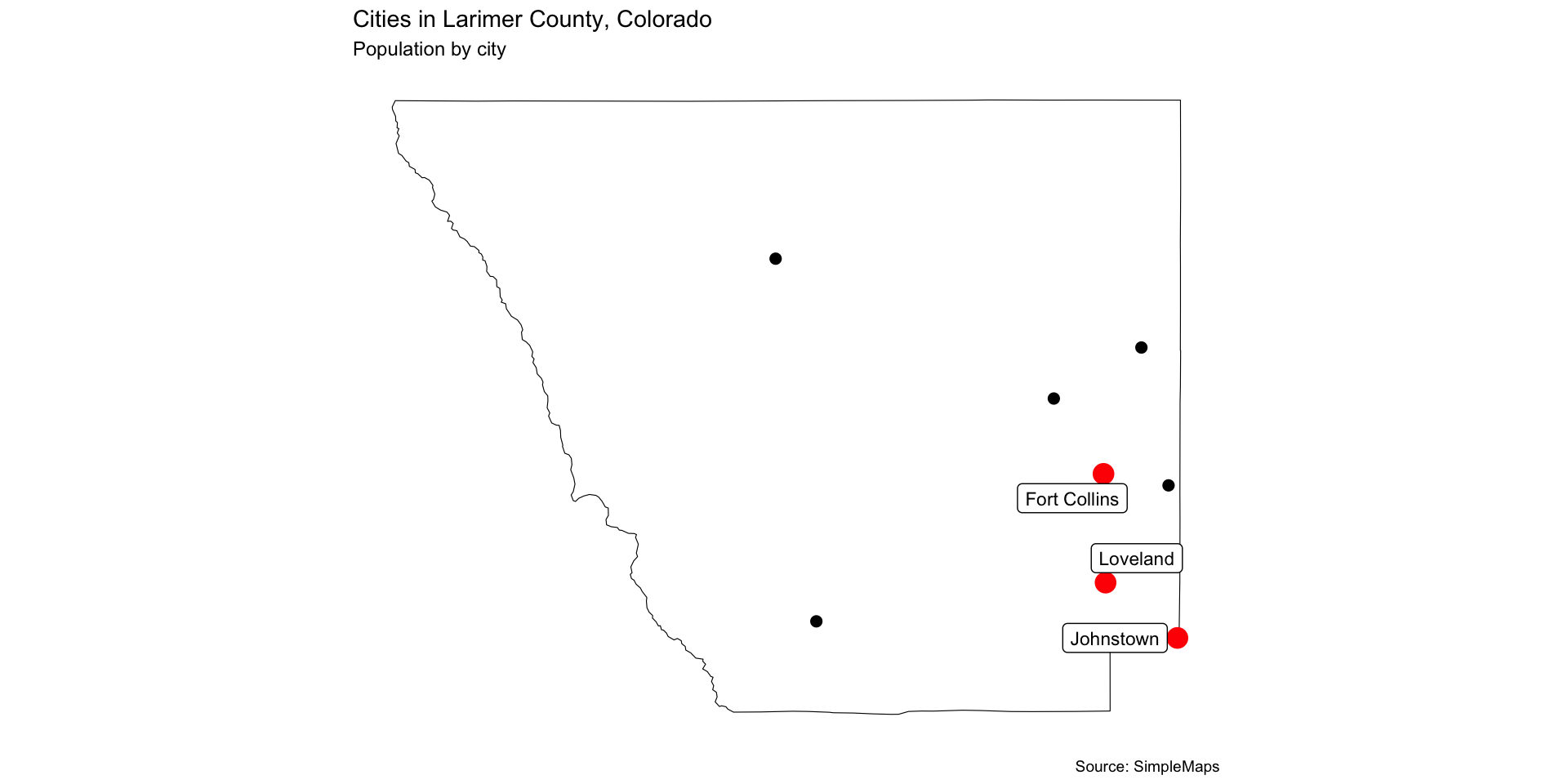 Next, determine the three cities in Larimer County with the highest population and add these to the map. Use a larger point size and a different color for the points will help them stand out.